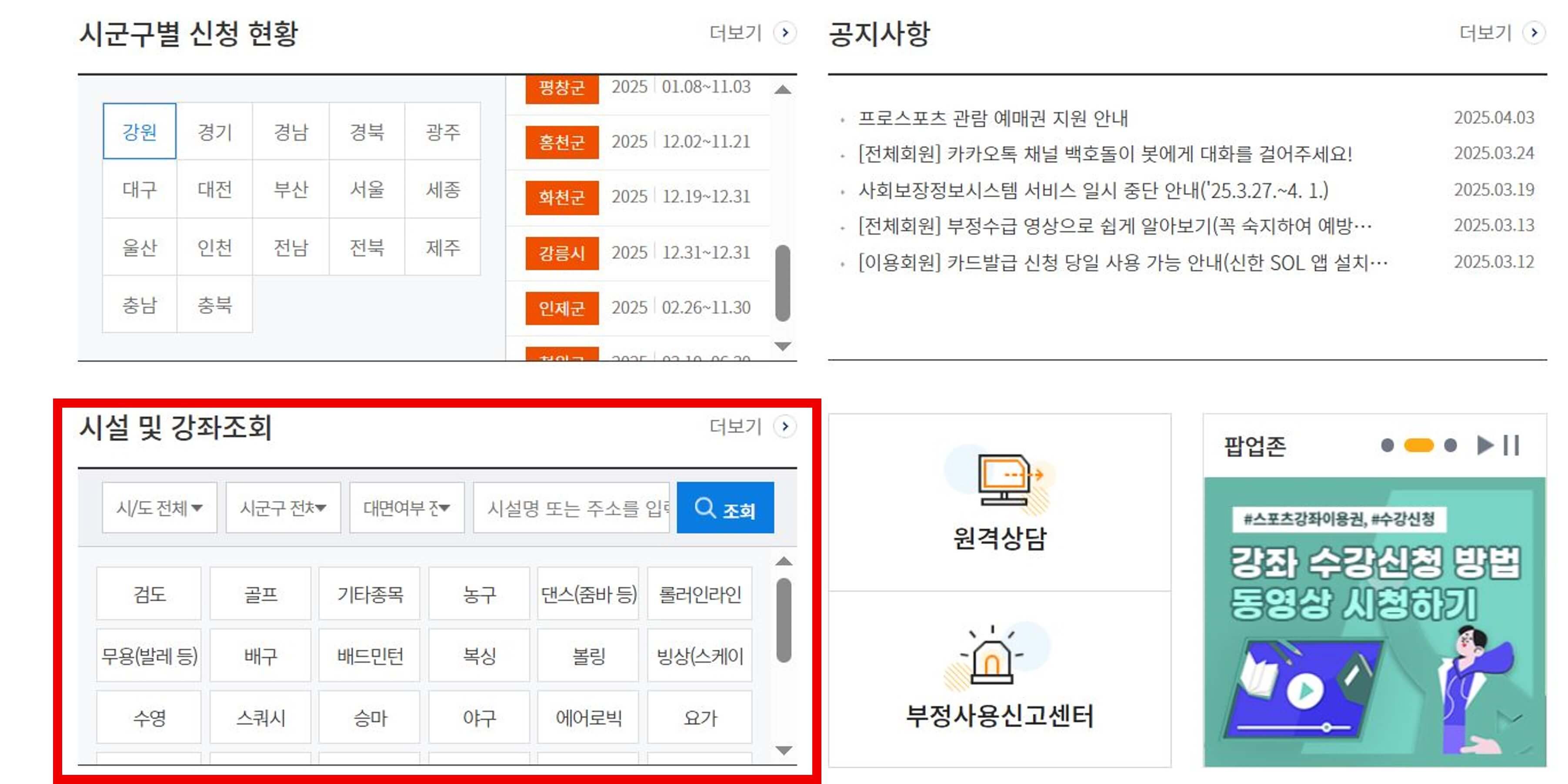 스포츠강좌이용권은 이제 홈페이지에서 강좌 검색부터 결제까지 한 번에 처리할 수 있는 시스템으로 바뀌었습니다.