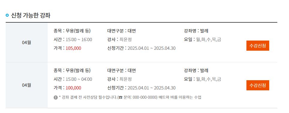 - 아래 신청가능한 시설 및 강좌가 나옵니다.