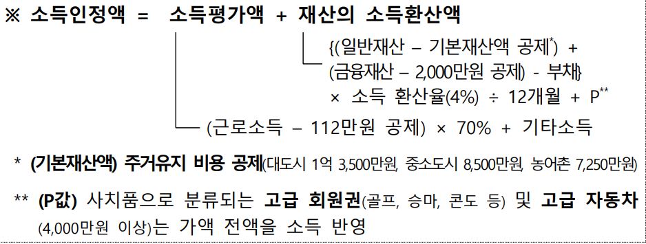 ✔ 재산 환산율: 재산에서 공제를 마친 금액에 **연 4%(월 0.33%)**를 곱해 소득으로 환산합니다.