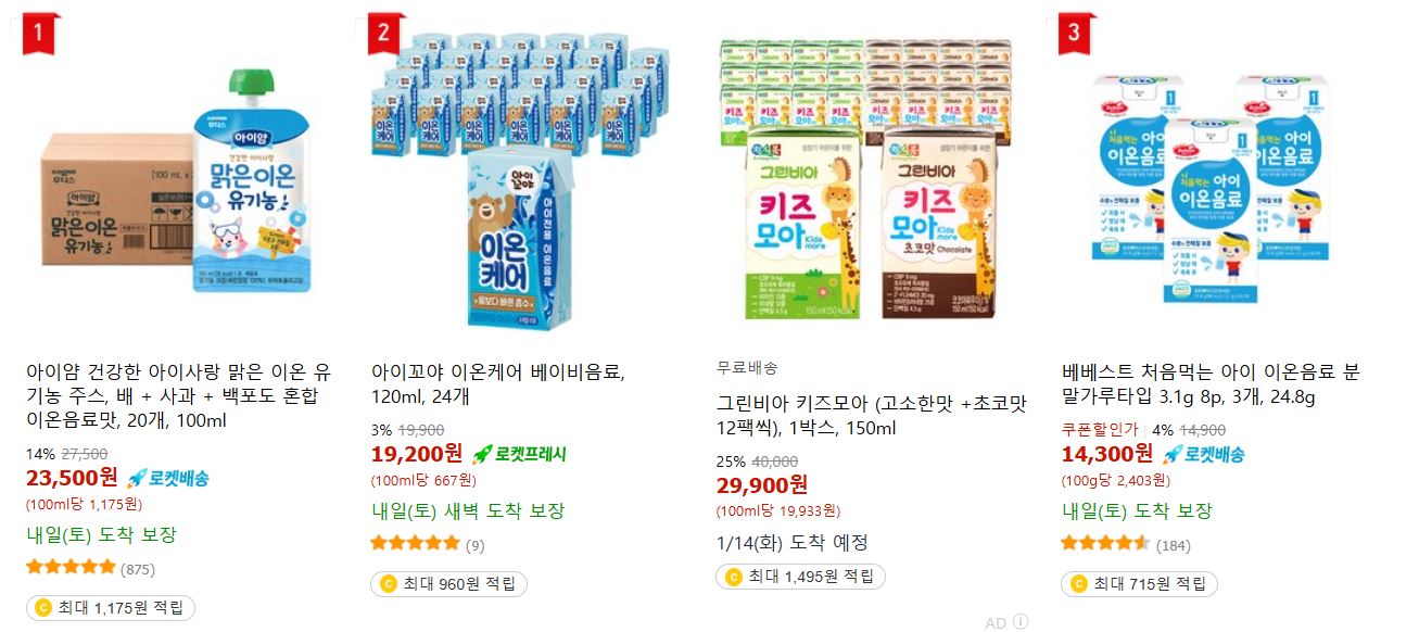 계속되는 고열로 탈수가 걱정이신 분들은 이온음료를 준비해보세요. 영,유아용이 이온음료가 따로 있으니 확인 후 구매하시기 바랍니다.