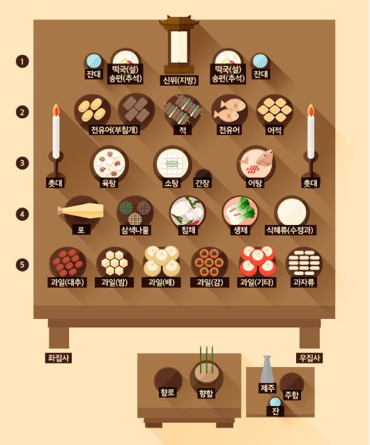 ✔ 서쪽(왼쪽): 나물, 전 등을 배열합니다.