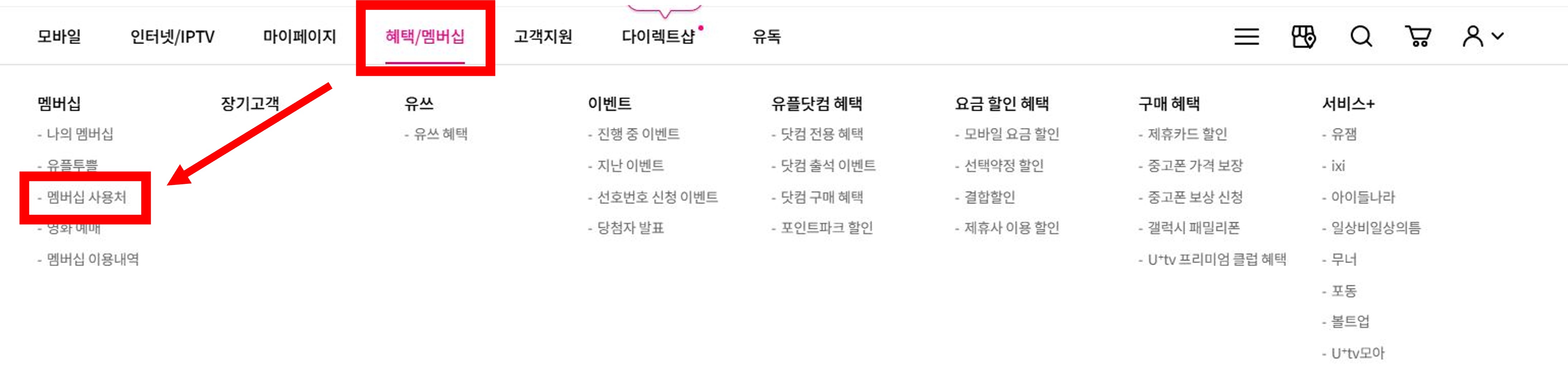 - 엘지 유플러스 사이트 들어가서 사람모양 클릭 후 로그인 → ‘혜택 멤버십 → ‘멤버십 사용처’ 클릭