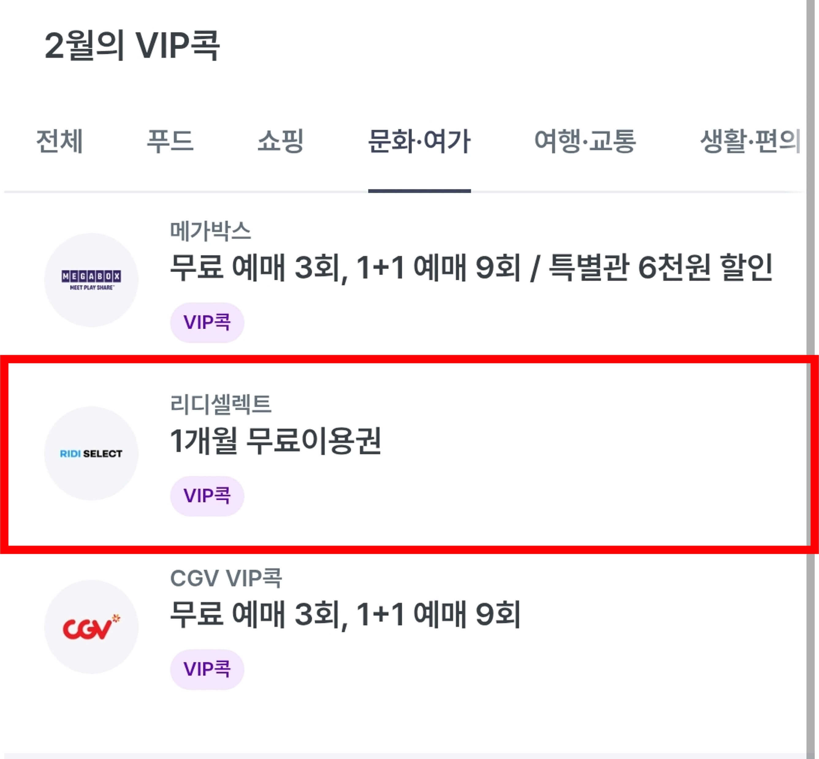 - VIP콕 클릭 →리디셀렉트 1개월 무료이용권 클릭